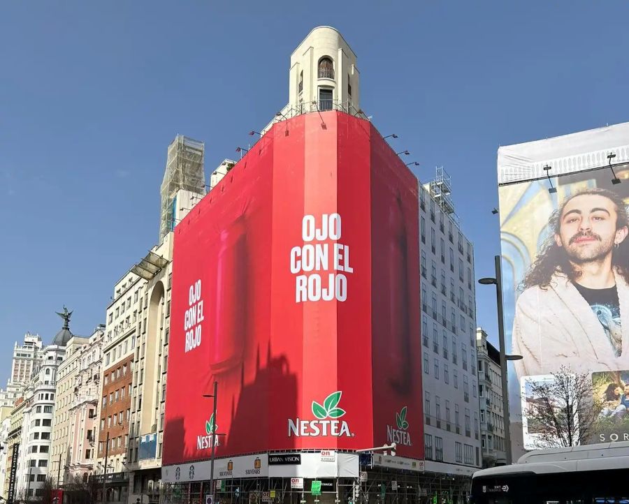 В центре Мадрида появилась загадочная наружная реклама холодного чая Nestea – огромный красный баннер на одной из главных улиц города, Гран-Виа. На баннере – силуэты банки и бутылки и короткая фраза “Ojo con el rojo” (“Осторожно, красный”). Никаких дополнительных объяснений бренд не дал, но именно эта недосказанность и стала частью рекламной стратегии.