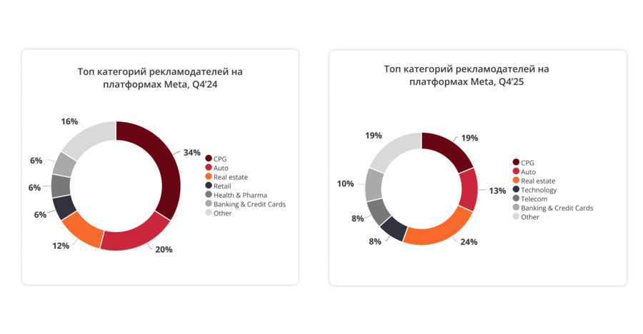 Распределение рекламных бюджетов в Meta за год заметно изменилось. Если в Q4 2024 основную долю занимал сегмент CPG (34%), то в Q4 2025 его доля снизилась до 19%. При этом выросла категория Real Estate – с 12% до 24%, став одним из лидеров. Категория Auto, наоборот, сократилась с 20% до 13%. В целом рынок стал более сбалансированным: бюджеты перераспределяются между категориями, а конкуренция усиливается.²