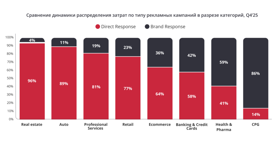 Подходы к размещению рекламы также различаются внутри категорий. В сегментах Real Estate, Auto и Professional Services преобладают кампании Direct Response, ориентированные на быстрые результаты. В категориях Health & Pharma и CPG, наоборот, доминируют Brand Response кампании, направленные на формирование спроса и узнаваемости. Ecommerce и Banking & Credit Cards чаще используют смешанный подход.²