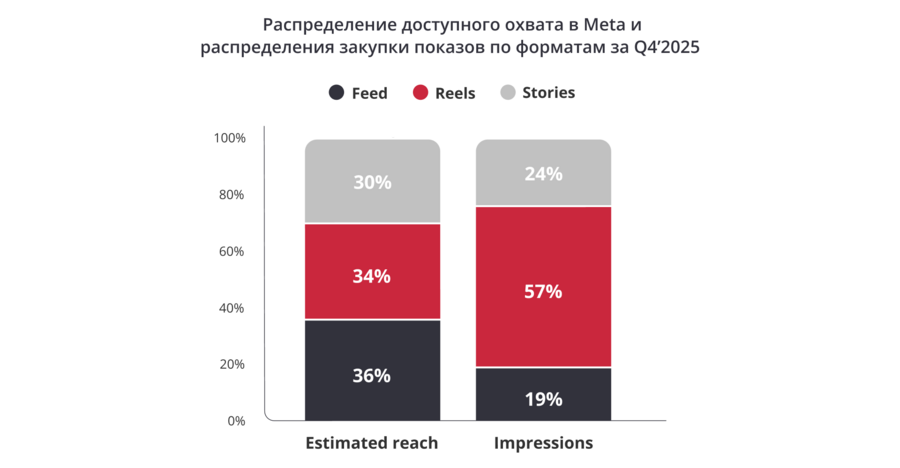 Распределение показов в Meta смещено в сторону Reels. При сопоставимом охвате именно этот формат получает основную долю доставки. Reels обеспечивает 57% показов при 34% охвата. Для сравнения, Feed при 36% охвата получает 19% показов, а Stories – 24% при 30% охвата. Алгоритмы Meta чаще отдают приоритет видеоформатам, так как они лучше удерживают внимание пользователей и обеспечивают более высокий отклик.²