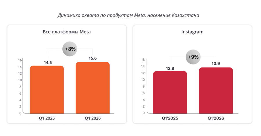 Анализ аудитории Meta в Казахстане, представленный Лаурой Айтмухамбетовой, Deputy Country Director Admixer Advertising в Казахстане, показывает устойчивый рост и усиление роли платформ в digital-коммуникации. По итогам первого квартала 2026 года совокупный охват экосистемы достиг 15,6 млн пользователей в месяц, увеличившись на 8% по сравнению с аналогичным периодом прошлого года.¹