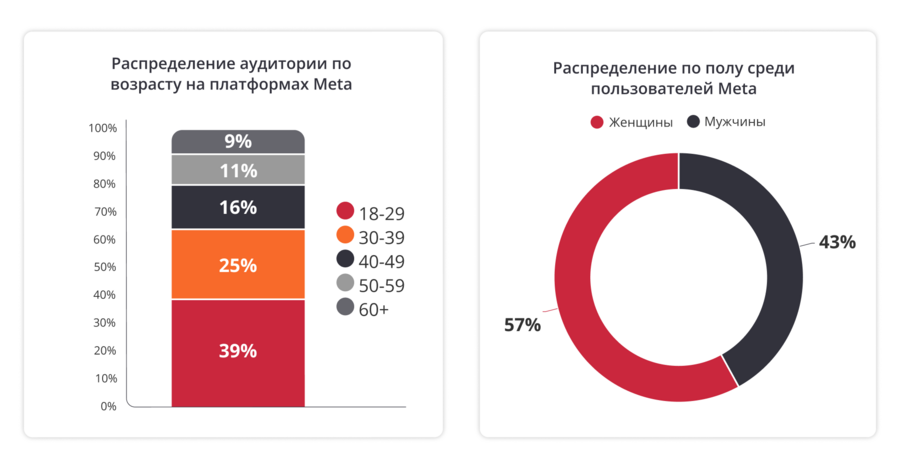 Совокупный охват платформ достигает 75% населения страны, что делает Meta ключевым каналом для построения масштабных коммуникаций. Основная часть аудитории сосредоточена в наиболее активных возрастных сегментах. В группе 18–29 лет охват достигает почти полного покрытия, увеличившись с 89% до 97% за последние полгода. В более широкой категории 18–49 лет показатель также остаётся стабильно высоким и составляет 92%.¹