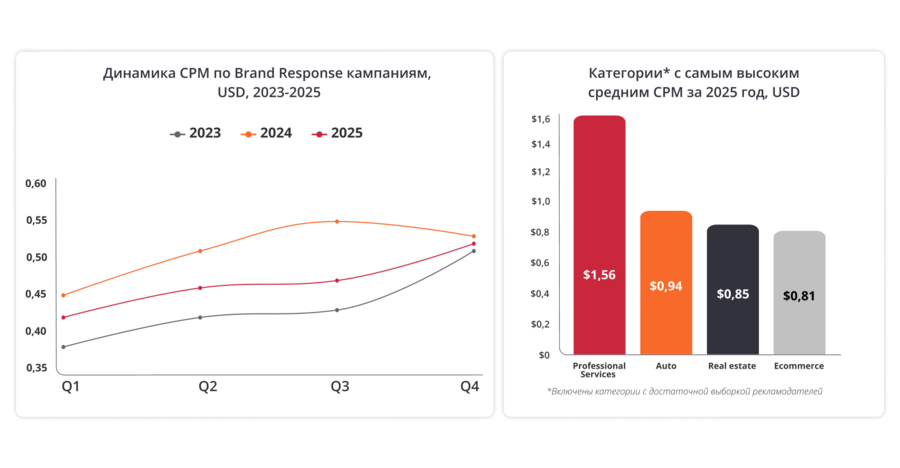 Различия по категориям показывают, что стоимость контакта с аудиторией существенно зависит от отрасли. Наиболее высокий средний CPM зафиксирован в сегменте Professional Services – $1,56, что отражает высокую конкуренцию и ценность аудитории. Далее следуют Auto ($0,94), Real Estate ($0,85) и Ecommerce ($0,81), где стоимость размещения остаётся ниже, но также демонстрирует устойчивый спрос со стороны рекламодателей.²