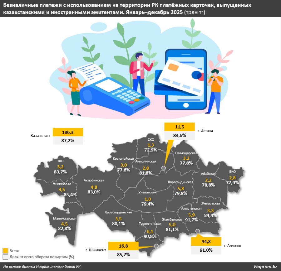 В региональном разрезе лидером по уровню “безнала” в 2025 году стала Алматинская область, где доля безналичных платежей составила 91,7% от всего оборота по картам, а объем – 5,9 трлн тг. Следом идут Алматы (91%) и Туркестанская область (90,8%).