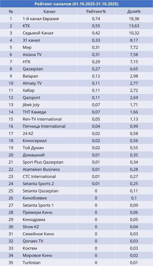 Согласно обновленным данным Национальной Медиа Ассоциации (НМА), в октябре устойчивое лидерство по прежнему удерживали новостные телеканалы, а семейные сериалы и вечерний юмор заметно усилили позиции. Также растет интерес к драмам о повседневной жизни и легким развлекательным форматам.