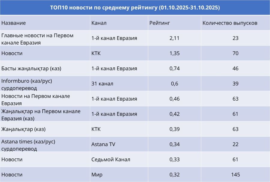 Новостной контент по-прежнему в топе. «Главные новости» на Первом канале Евразия — абсолютный лидер по среднему рейтингу, с высокой регулярностью и стабильной аудиторией. Новости КТК — уверенное второе место, с наибольшим количеством трансляций.