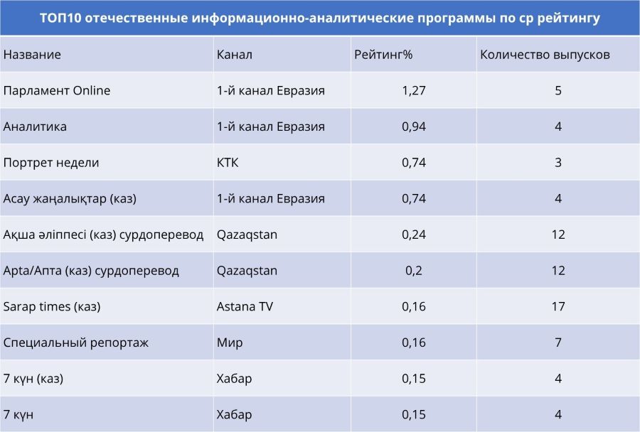 Информационно-аналитические форматы укрепляют позиции. «Портрет недели» на КТК — лидер по максимальному рейтингу, а «Парламент Online» на Первом канале Евразия — по среднему. Также в топе — «Аналитика», «Асау жаңалықтар», «Апта», «Sarap times», «Пульс планеты».