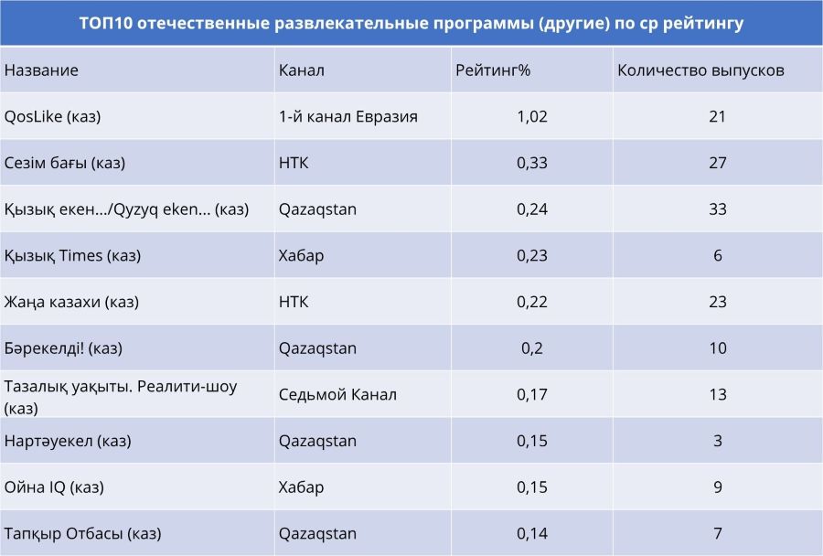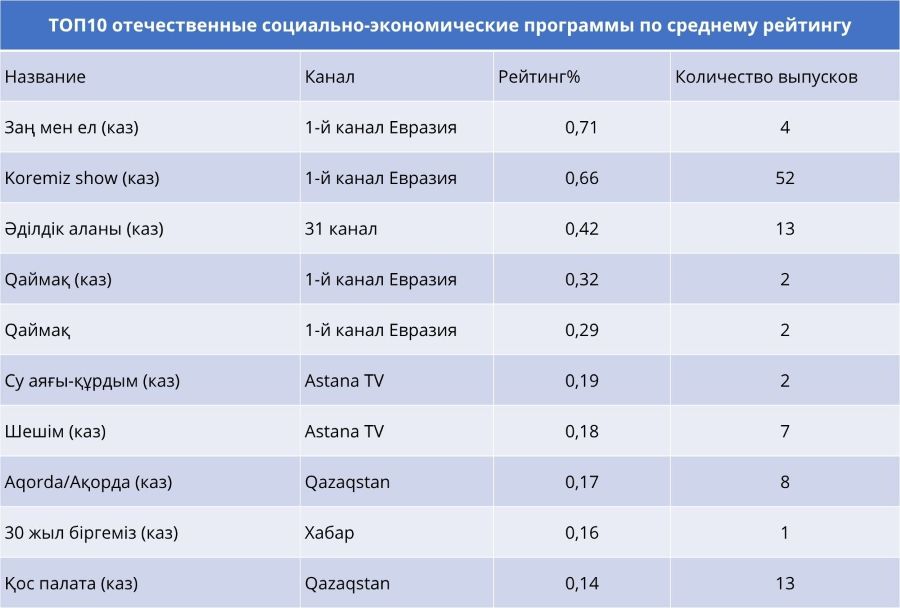 Социально-экономические программы укрепляют позиции. «Koremiz show» и «Заң мен ел» на Первом канале Евразия лидируют, в тройке лидеров уверенно чувствует себя ток-шоу «Әділдік аланы» на 31 канале с 13-ю выпусками. Темы права, предпринимательства, реформ и регионального развития находят отклик у аудитории.