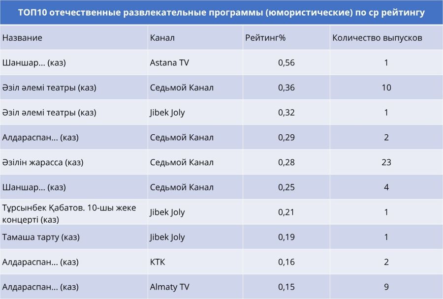Юмор на казахском языке остаётся востребованным, особенно в пятницу и субботу — как способ расслабиться и переключиться. Седьмой канал демонстрирует уверенное лидерство в этом сегменте, особенно по количеству выпусков.