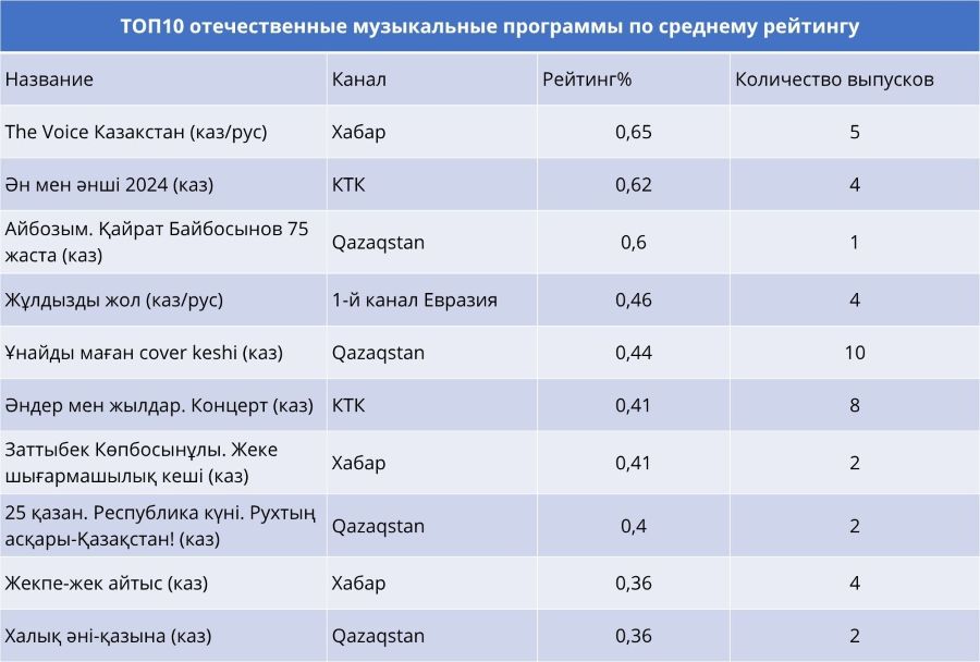 «The Voice Казахстан» на Хабар и «Ән мен әнші» на КТК — лидеры по среднему рейтингу. Спецвыпуски и юбилейные концерты также вошли в топ, особенно на Qazaqstan. Национальные мотивы, живые выступления и праздничные эфиры — всё это формирует культурную атмосферу месяца.