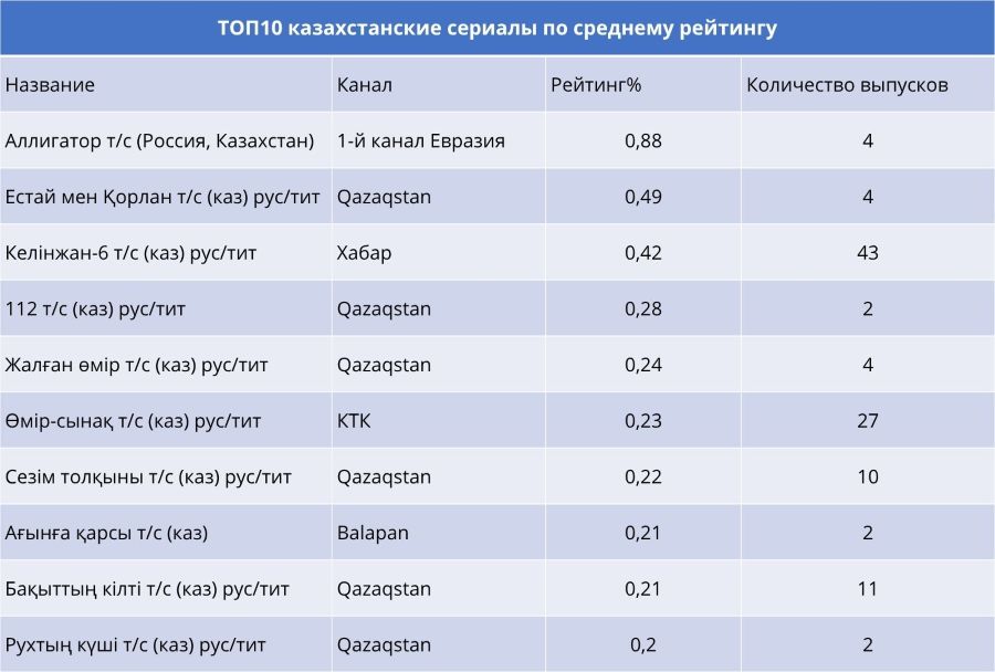 Сериалы — важная часть вечернего эфира. «Келінжан-6» (Хабар) и «Аллигатор» (1-й канал Евразия) — лидеры месяца. Также в топе — «Зу-Зу Күлпәш», «Естай мен Қорлан», «Дарын мен Айзере». Сюжеты о семье, любви, бизнесе и преодолении находят отклик у зрителей всех возрастов.