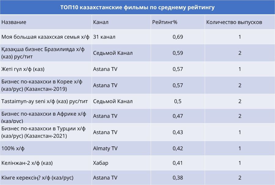 Комедийные франшизы, семейные драмы и фильмы с локальным колоритом продолжают удерживать внимание зрителей. «Моя большая казахская семья» на 31 канале имела самый высокий средний рейтинг среди фильмов. Сразу 5 строчек в данной категории в октябре занял телеканал Astana TV.