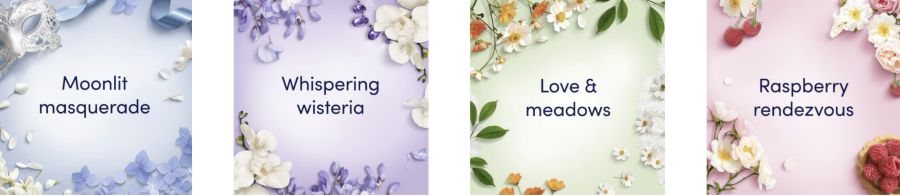 Названия ароматов – Whispering Wisteria, Moonlit Masquerade, Raspberry Rendezvous, Love & Meadows – звучат как главы светского романа и работают ровно на том же уровне ассоциаций, что и сам сериал: романтика, тайные встречи, вечерние приемы и разговоры, которые «не должны были быть услышаны».