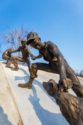 Скульптура воссоздает эту сцену. Рука последней фигуры намеренно выведена за пределы ограждения – так, чтобы любой прохожий мог взяться за неё и буквально стать частью этой цепи.