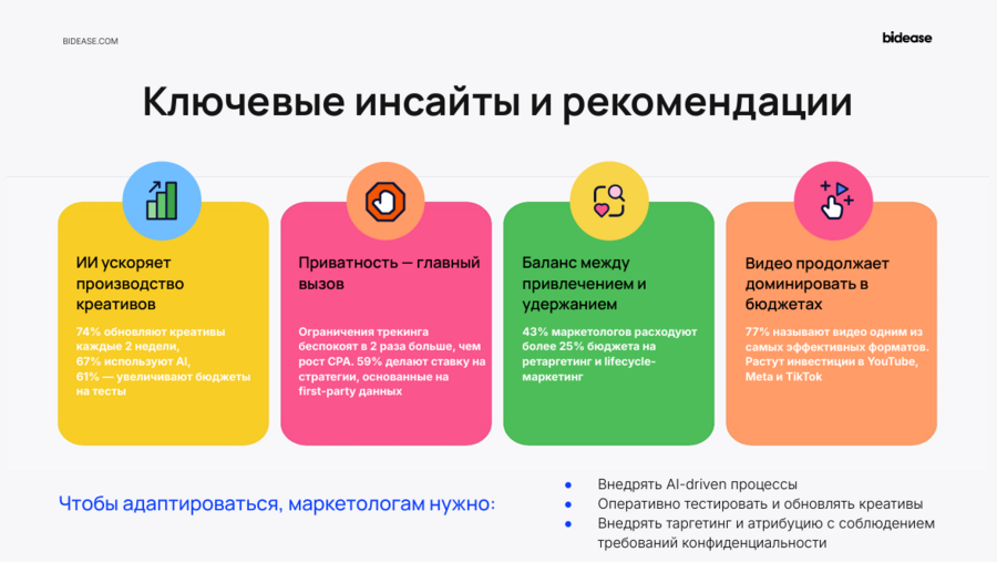 Роман отметил, как маркетологи реагируют на рост конкуренции. Так, 61% рекламодателей инвестируют в тестирование креативов, 54% активно собирают first-party данные, а 48% — пробуют новые рекламные каналы.