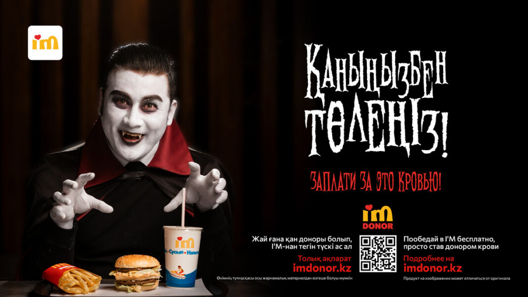 I’M (бывший McDonald’s Казахстан) запустил яркую социальную акцию “I’m Donor” со слоганом “Ты заплатишь за это кровью”: каждый, кто сдавал кровь, получал 2000 бонусов в ресторанах сети. Участник знакомился с условиями акции на сайте imdonor.kz, сдавал кровь в партнерском центре, после чего получал сертификат-промокод, который можно было активировать в приложении I’M и потратить на блюда.