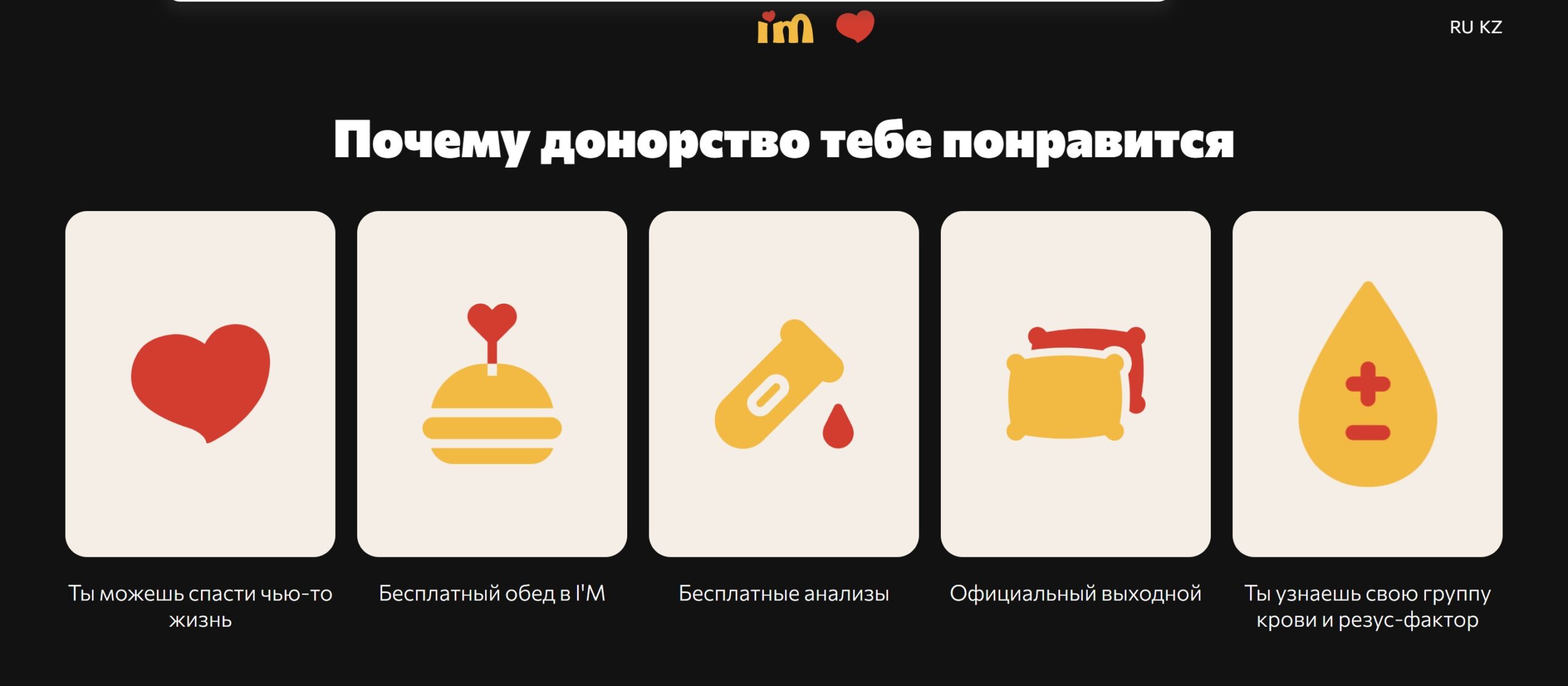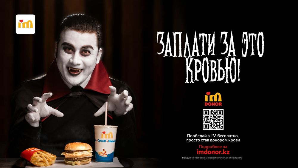 Так, I’m (бывший McDonald’s Казахстан) запустил яркую социальную акцию “I’m Donor” со слоганом “Ты заплатишь за это кровью”: каждый, кто сдаёт кровь, получает 2000 бонусов в ресторанах сети. Участник акции регистрируется на портале imdonor.kz, сдает кровь в партнерском центре, после чего получает сертификат-промокод, который можно активировать в приложении I’m и потратить на блюда до 30 ноября. Но если казахстанцы проявят интерес, то компания готова продлить акцию.