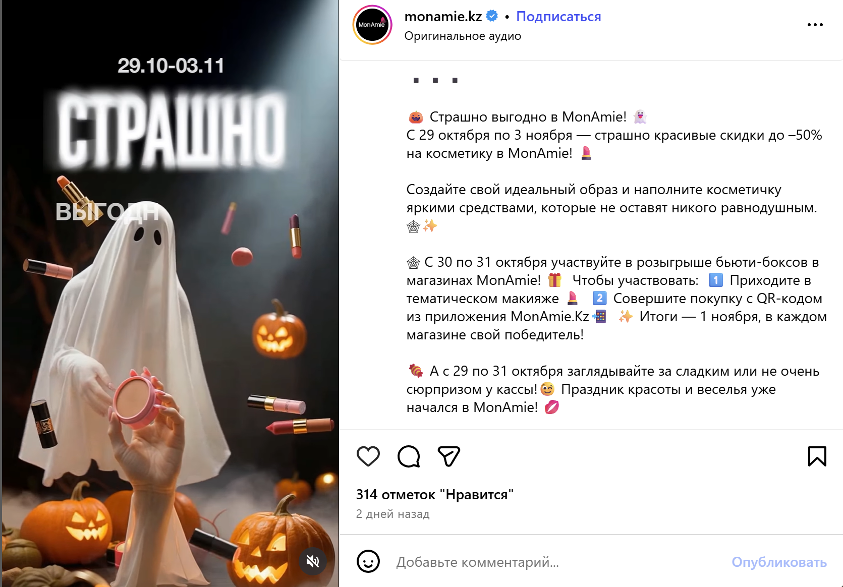 Бьюти-бренд Mon Amie поддержал атмосферу Хэллоуина серией публикаций в Instagram. В коротких рилсах команда показала, как сделать лёгкий тематический макияж. Помимо обучающих видео, бренд запустил мини-акцию с pre-Halloween-скидками и офферами на декоративную косметику.