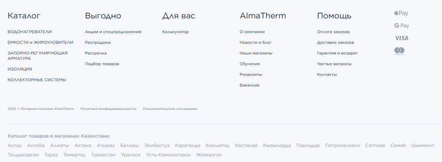 Далее были созданы и оптимизированы региональные страницы. Анализ поискового спроса показал, что пользователи часто ищут инженерную сантехнику вместе с указанием своего города. Мы учли это и создали отдельные страницы категорий под регионы, где у Almatherm есть магазины или работает доставка.