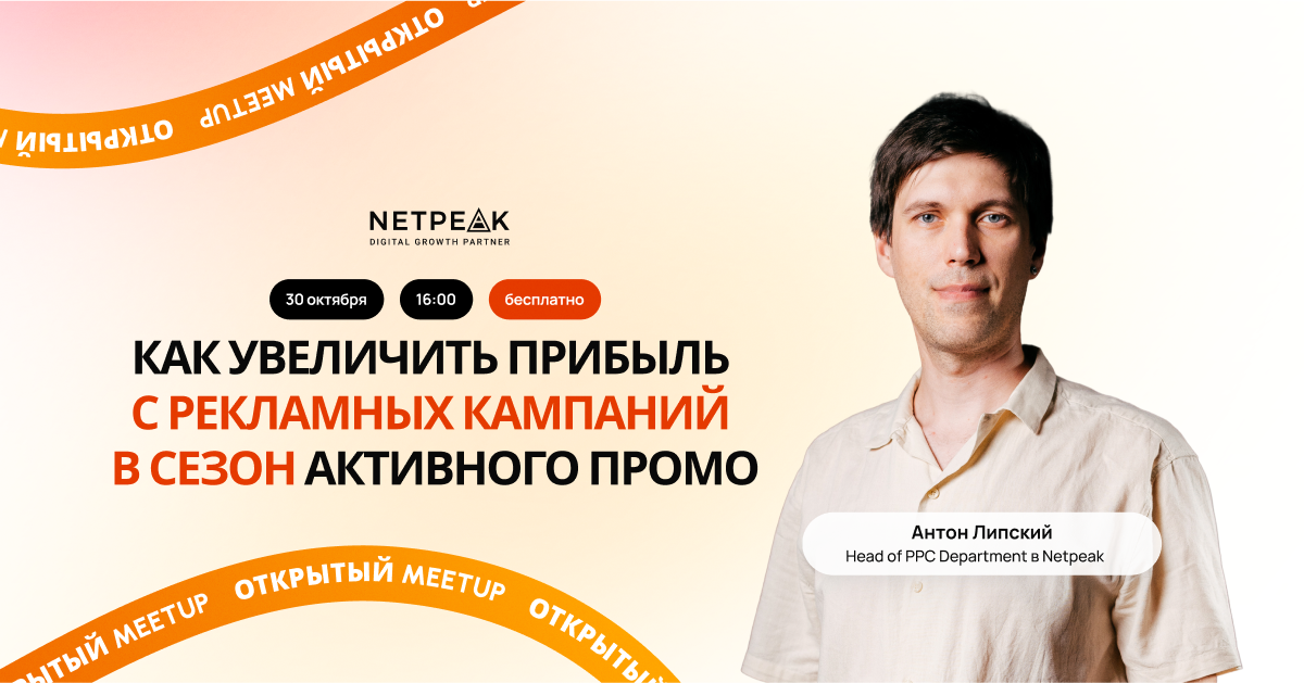 30 октября в 16:00 состоится онлайн-митап Netpeak Kazakhstan — «Как увеличить прибыль с рекламных кампаний в сезон активного промо: от Чёрной пятницы до Нового года». На митапе участники смогут оценить готовность своих рекламных кампаний к пику сезона.