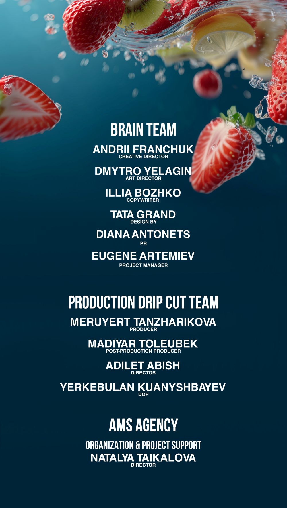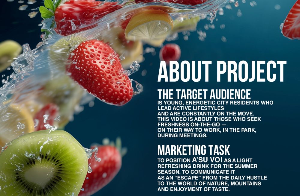 Летом 2025 года агентство AMS agency в партнерстве с Brain Tank реализовало кампанию для бренда вкусовой воды A’suVO (компания RG Brands). Ролик стал одним из самых заметных летних запусков — лёгкий, свежий, по-летнему фантазийный.