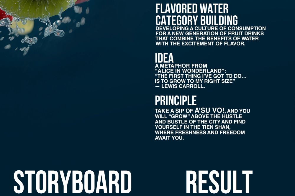 Главная идея кампании — представить A’suVO как символ освобождения от городской суеты. Один глоток — и ты уже не среди пыльных, раскалённых улиц мегаполиса, а в прохладе гор Тянь-Шаня, где воздух прозрачен, а вода чиста и живая. Это ощущение стало метафорой всей коммуникации, вдохновлённой строкой из «Алисы в стране чудес» Льюиса Кэрролла: