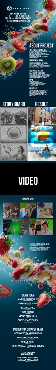 Видеоролик длится 25 секунд, но вмещает целую микровселенную: живые городские кадры, динамичную CGI-анимацию и магический реализм. Фрукты оживают, пузырьки сверкают, а пейзаж Алматы постепенно растворяется в панорамах Тянь-Шаня.