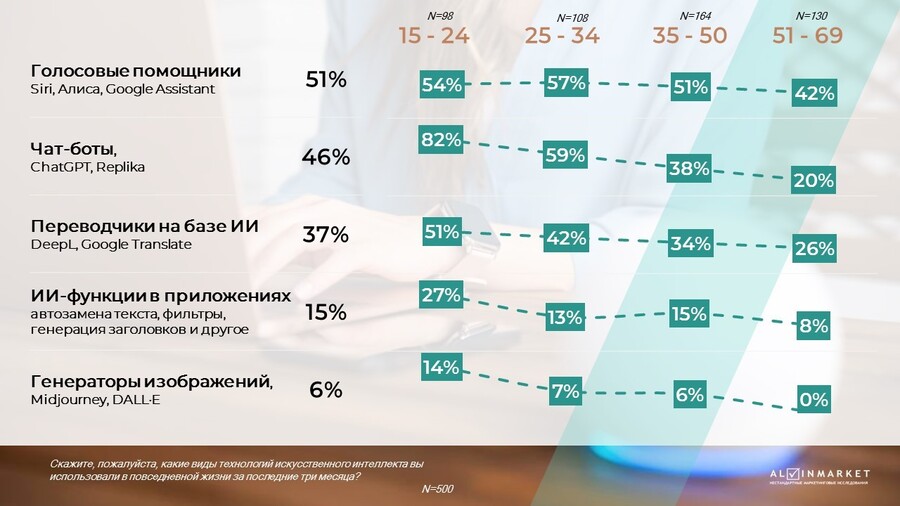 Самыми активными пользователями ИИ оказались молодые люди от 15 до 24 лет: 82% этой аудитории уже общаются с чат-ботами, что в четыре раза выше, чем среди старших поколений. Для них нейросети — часть повседневности: помощь в учёбе, переводы, планирование маршрутов и даже эмоциональная поддержка.