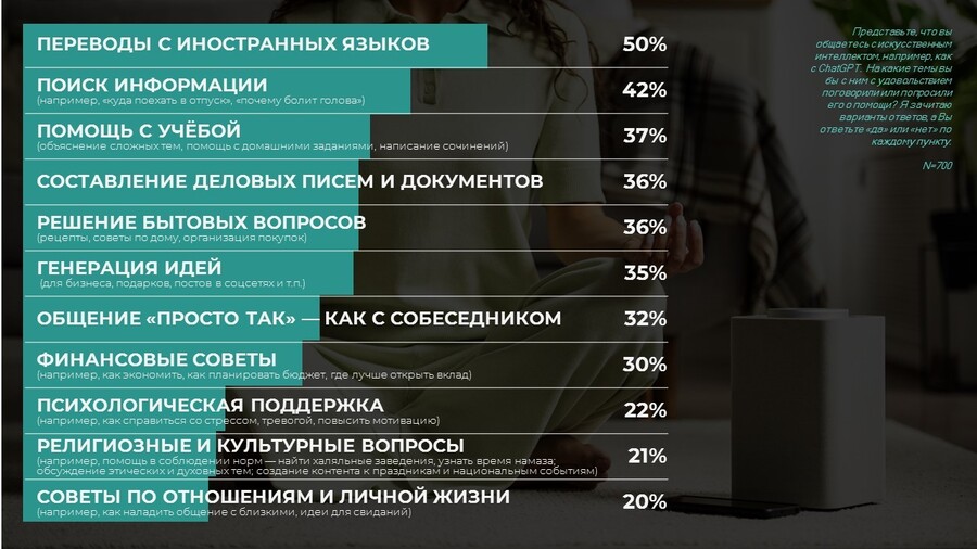 Если сначала нейросети воспринимались главным образом как удобный инструмент для переводов или быструю замену поисковикам, то теперь их функции выходят далеко за рамки практических нужд. Всё заметнее роль ИИ как собеседника: 32% опрошенных признаются, что общаются с ним «для себя», а каждый пятый ждёт от такой беседы эмоциональной поддержки или возможности обсудить личные темы.