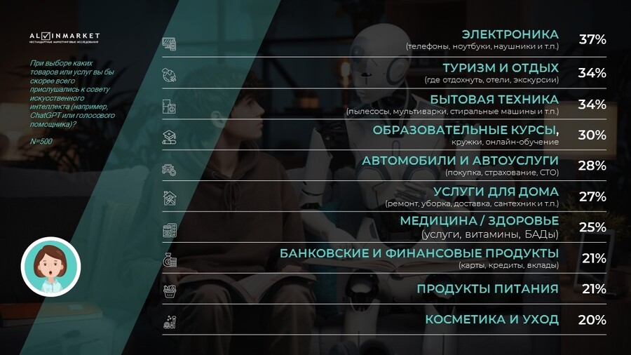 Иными словами, почти каждый четвёртый пользователь открыт к тому, чтобы переложить принятие решения на цифрового помощника. Для сравнения: доля классических новаторов в любой категории обычно не превышает 2,5%, а ранних последователей — около 13%. Здесь же мы наблюдаем выход далеко за пределы этих групп, что ясно показывает: искусственный интеллект перестал быть модной игрушкой и стал реальным фактором, меняющим потребительское поведение.
