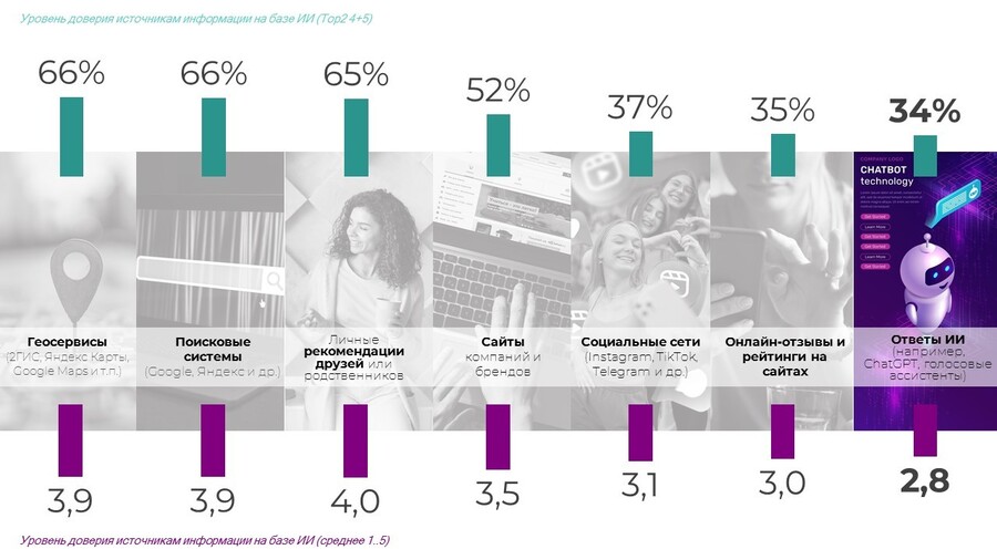 На первых позициях остаются привычные и проверенные временем источники — геосервисы, поисковые системы и советы друзей, которые стабильно набирают около 65–66% доверия. Эти каналы воспринимаются как прозрачные и предсказуемые, а значит, надёжные.