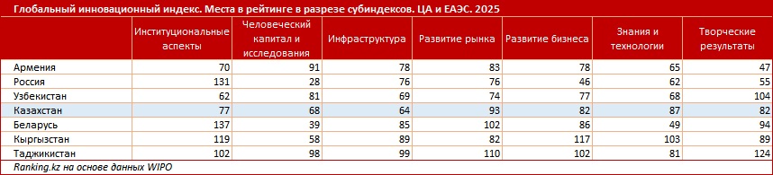 Узбекистан продемонстрировал самый заметный прогресс в регионе — впервые заняв 79-е место и обойдя Казахстан. По данным WIPO, страна улучшила позиции по четырём из семи субиндексов, включая «Человеческий капитал», «Инфраструктуру» и «Развитие рынка». Наибольший рост наблюдается в разделе «Знания и технологии», что указывает на повышение результативности инновационных инвестиций.