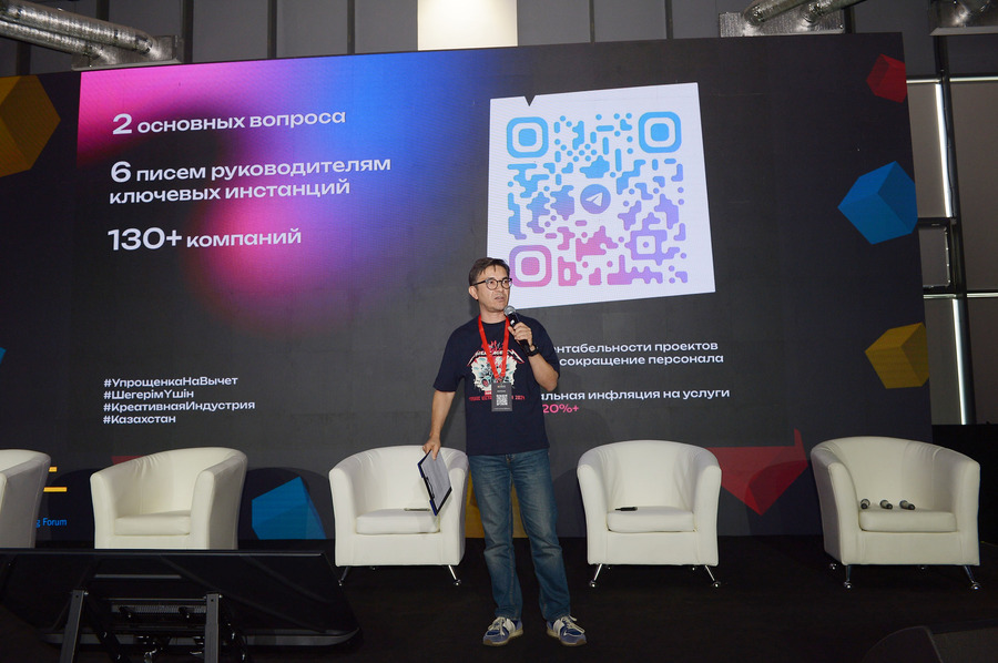 Затем на сцену поднялся сооснователь Mosaic agency Гани Жаркинбаев.  Он выступил с «Пятью минутами на злободневную тему», затронув изменения в налоговом кодексе, которые напрямую касаются креативного сектора.