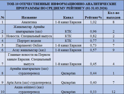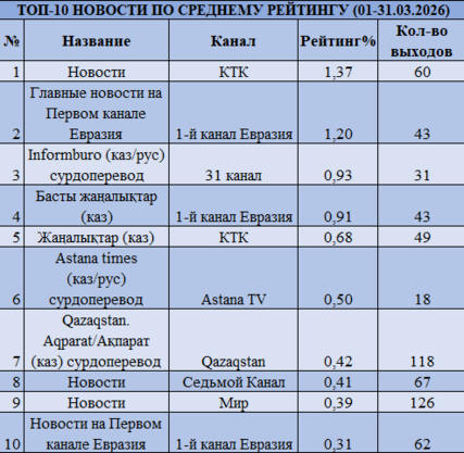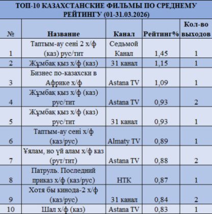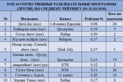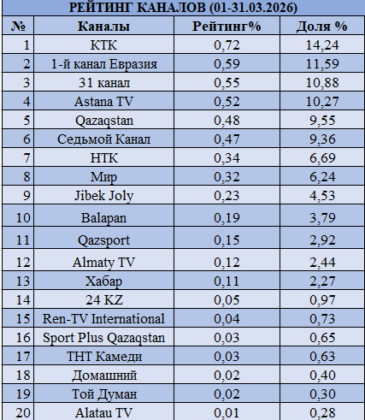 Лидером остается КТК — рейтинг 0,72% и доля 14,24%. Далее следуют Первый канал Евразия (0,59% и 11,59%), 31 канал (0,55% и 10,88%), Astana TV (0,52% и 10,27%) и Qazaqstan (0,48% и 9,55%). В отличие от февраля, усиливается конкуренция — во многом за счет праздничного эфира и роста доли entertainment-контента.