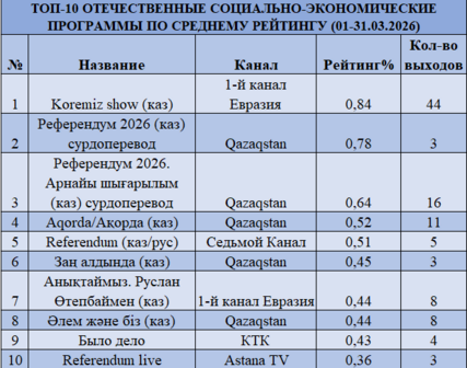 В социально-экономическом сегменте лидирует Koremiz show (0,84% при 44 выходах). Существенное влияние на повестку оказал референдум: проекты на Qazaqstan занимают несколько позиций с рейтингами до 0,78%, подтверждая прямую зависимость телесмотрения от общественно-политической повестки.