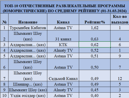 Юмористический контент в марте, напротив, показывает заметный рост. Абсолютный лидер — «Тұрсынбек Қабатов» на Astana TV с рейтингом 1,62% (1 выход), один из лучших результатов месяца. Также в топе «Шымкент Шоу» и «Алдараспан» с показателями 0,45–0,63%. После спада в феврале сегмент восстанавливается благодаря праздничному эфиру.