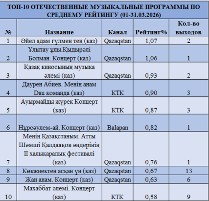 Музыкальные передачи в марте стали смотреть чаще. Лидер — «Әйел адам гүлмен тең» на Qazaqstan — 1,07%, далее — «Ұлытау ұлы. Қыдырәлі Болманов. Концерт» (1,06%) и «Қазақ киносының музыка әлемі» (0,93%). Концертные форматы на КТК также показывают устойчивые результаты — до 0,90%.