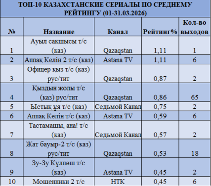 В сериальном сегменте наблюдается выравнивание: «Ауыл сақшысы» на Qazaqstan и «Аппақ келін 2» на Astana TV набирают по 1,11%. Далее — «Офицер қыз» (0,87%) и «Қыздың жолы» (0,86% при высокой частоте 65 выходов). В отличие от февраля, где доминировали длинные сериалы, в марте усиливается конкуренция за счет разнообразия контента.