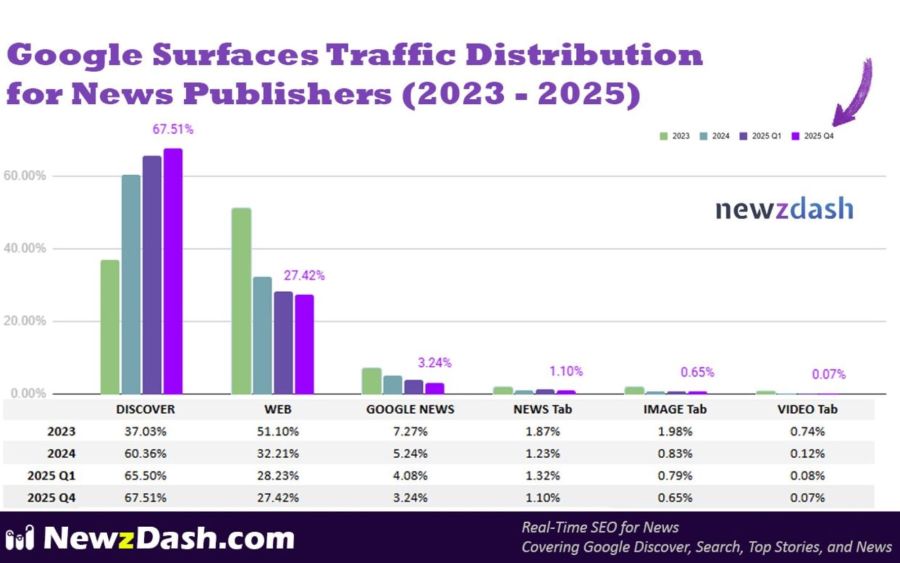 Параллельно с падением доли Web Search стремительно рос Google Discover: к концу 2025 года на него приходится уже 67,5% всего трафика новостных сайтов, получаемого из сервисов Google. Фактически индустрия перешла от модели «пользователь ищет новости» к модели «алгоритмы решают, какие новости пользователь увидит».