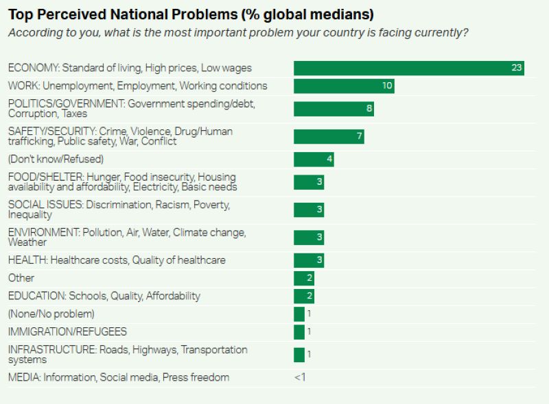 Любопытно, что темы, которые часто доминируют в международной повестке – климат, здравоохранение, образование, миграция, – в ответах людей звучат заметно реже. Это не означает, что они не важны, однако Gallup обращает внимание на разрыв между риторикой элит и тем, что люди считают первоочередным здесь и сейчас.