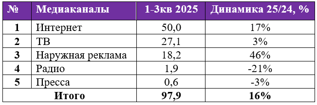 Суммарный объем рекламы в средствах ее распространения (ТВ, Интернет, Наружная реклама, Радио, Пресса) составил порядка 98 млрд тенге, что на 16% больше по сравнению с тремя кварталами 2024 года (табл.№1, диагр.№1).