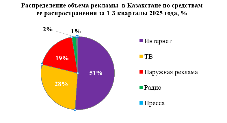 Таким образом, структура рекламного рынка в Казахстане по итогам 1-го полугодия 2025 года выглядит следующим образом: