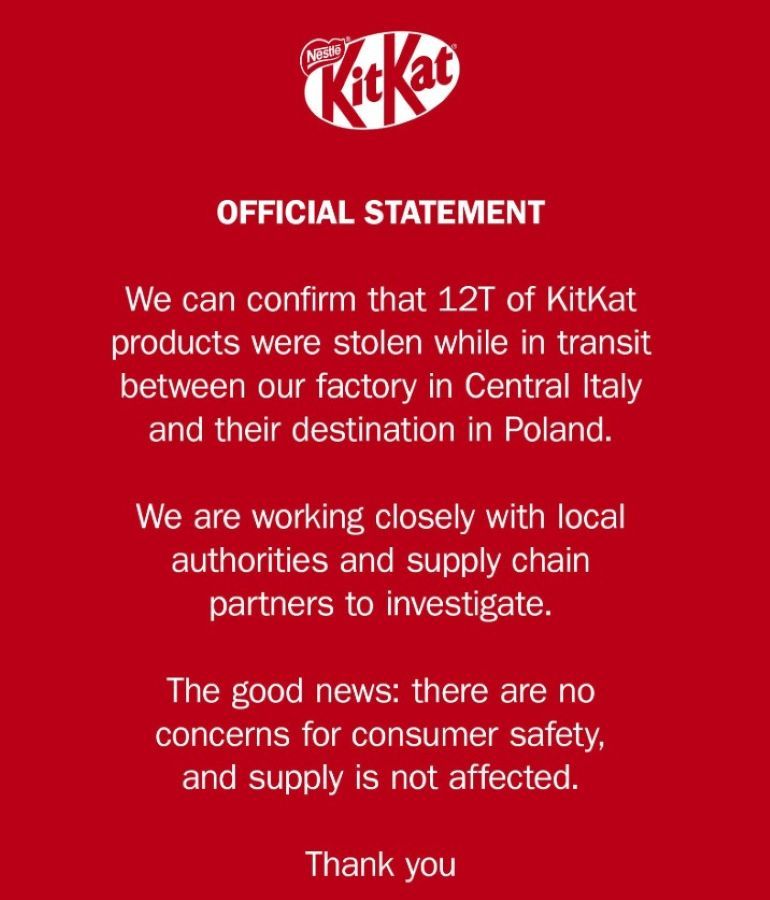 Итак, в Европе пропал грузовик, перевозивший около 12 тонн шоколада KitKat – это 413 793 батончика. Машина следовала из Италии в Польшу, и часть партии была связана с запуском новой линейки, в том числе продуктами, приуроченными к “Формуле-1”. Груз и транспортное средство до сих пор не найдены, расследование продолжается с участием правоохранительных органов.