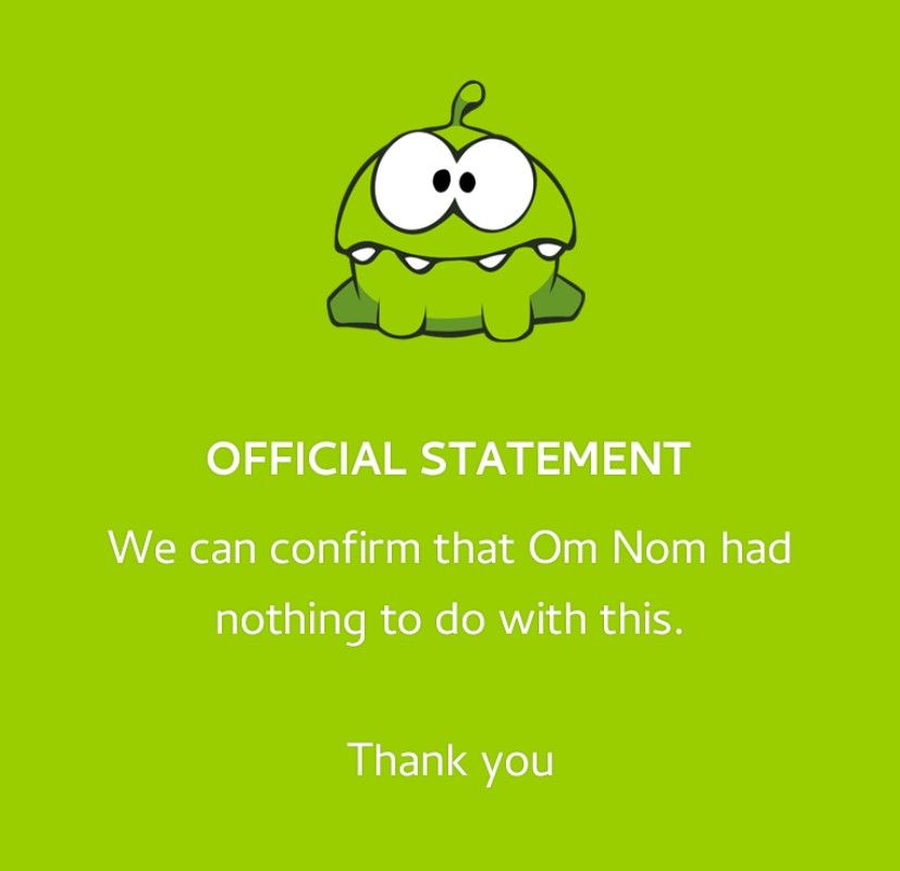 К флешмобу подключился и главный поедатель сладостей в мире мобильных игр — Ам Ням (Om Nom) из игры Cut the Rope: “Мы можем подтвердить, что Ам Ням не имеет к этому никакого отношения. Спасибо”.