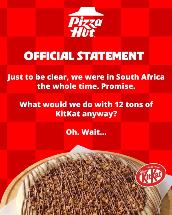 В своем сообщении сеть пиццерий Pizza Hut сообщила, что это не они украли грузовик. “Да и что бы мы делали с 12 тонн KitKat? Хотя подождите…”