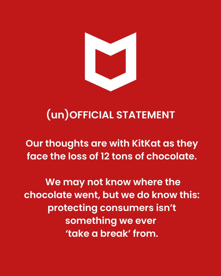 Компания McAfee, специализирующаяся на кибербезопасности, воспользовалась возможностью, чтобы подчеркнуть преимущества своих услуг, заявив: “Мы, может быть, и не знаем, куда делся шоколад, но мы точно знаем – в защите потребителей мы никогда не делаем перерывов”.