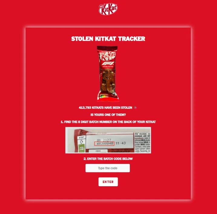 Одним из первых элементов стал Stolen KitKat Tracker – инструмент, позволяющий проверить батончик по batch-коду. Пользователям фактически предложили  поучаствовать в поиске украденного шоколада, что перевело аудиторию из позиции наблюдателя в участника.