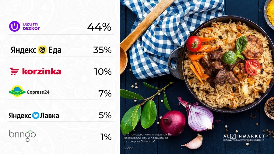 Если рассмотреть, какими сервисами доставки еды и продуктов чаще всего пользуются жители Узбекистана, проявляется знакомая тенденция. Лидирует локальная платформа Uzum Tezkor, набравшая 44%.