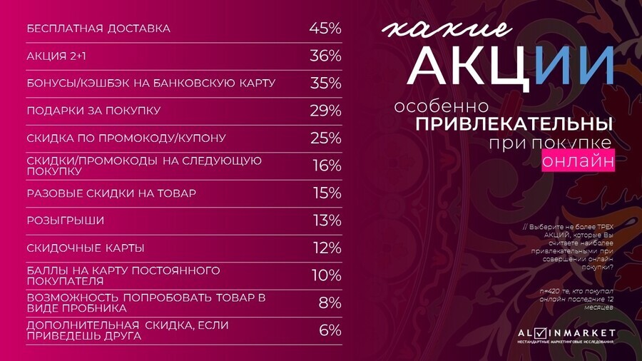 Как ни удивительно, классические скидки оказались в конце списка: разовые предложения, промокоды и скидочные карты. Это показывает, что покупатели становятся устойчивыми к привычным «базовым» акциям и всё чаще реагируют только на конкретную, ощутимую выгоду здесь и сейчас.