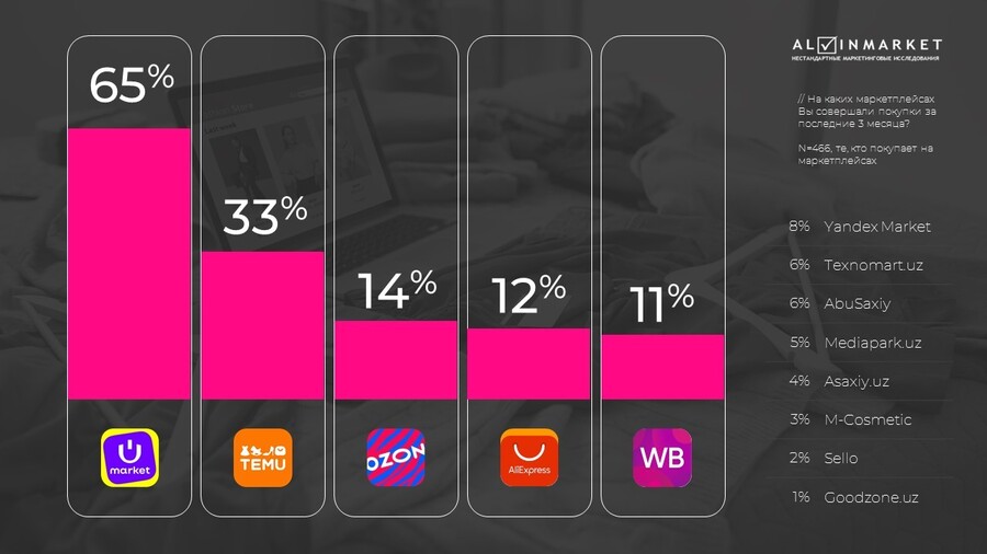 На рынке онлайн-торговли Узбекистана сформировался явный лидер — Uzum Market, который указали 65% респондентов. Это почти вдвое больше, чем у ближайшего конкурента.